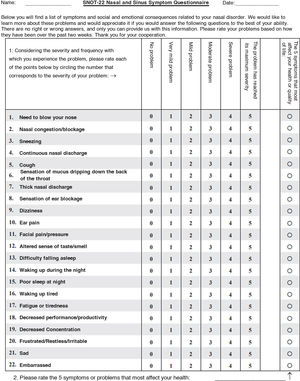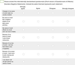 To subjectively assess the impact of olfactory dysfunction on patients’ quality of life and emotional state, the following were used: the Visual Analogue Scale for Olfactory Loss (VAS-Olfactory),13 the Nasosinusal Symptoms Questionnaire SNOT-22 (Appendix 1),14 the short version of the Questionnaire of Olfactory Disorders-Negative Statements (svQOD-NS) (Appendix 2)15,17 and the Olfactory Quality of Life Test (QVOLF). The order of administration of the questionnaires was the same for all participants, and randomisation was not performed. Completion was carried out in a consultation supervised by the research team to ensure the homogeneity of the process. The questionnaires were self-administered, and the evaluators were blinded to their results.