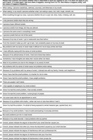 Seventeen items on olfactory quality of life, representing the QOD-NS (Questionnaire of Olfactory Disorders - negative statements),18 which is a reduced version of the QOD (Questionnaire of Olfactory Disorders), where a higher score indicates greater impairment.19