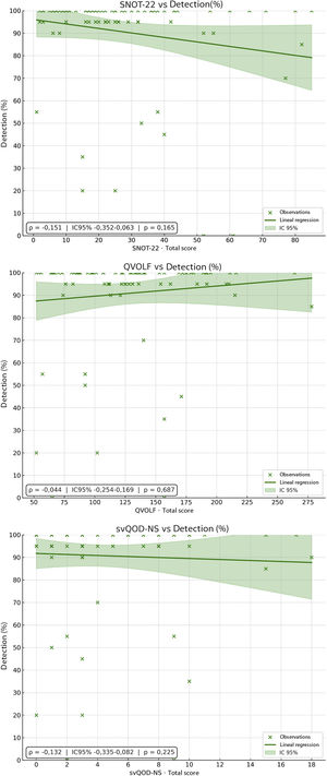 ConclusionesQVOLF y svQOD-NS son más sensibles que SNOT-22 para evaluarla disfunción olfativa. La ausencia de correlación con pruebas psicofísicas resalta la necesidad de combinar ambas para una evaluación integral.