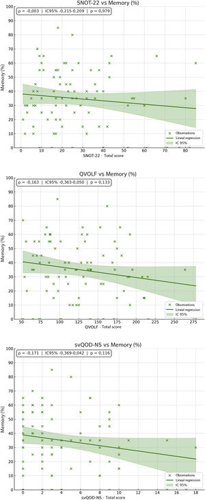 Materials and methodsA prospective study was conducted including 86 adults with olfactory dysfunction ≥ 6 months after SARS-CoV-2 infection. Clinical and demographic data and scores from the Visual Analog Scale for smell (VAS-smell) and the SNOT-22, svQOD-NS, and QVOLF questionnaires were collected. Olfactory function was assessed using the BAST-24 (detection, identification, and olfactory memory). Descriptive statistics, Spearman’s correlation coefficient, and the Mann-Whitney U test were used (p<0.05).