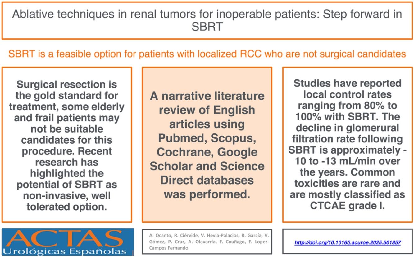 Material and methodsA narrative literature review of English articles using Pubmed, Scopus, Cochrane, Google Scholar and Science Direct databases was performed focusing on prospective and relevant retrospective studies. Search terms included “kidney cancer”, “renal cell carcinoma”, “stereotactic radiotherapy”, “radiofrequency ablation”, “cryoablation”, “microwave ablation”, “SBRT” and “SABR”.