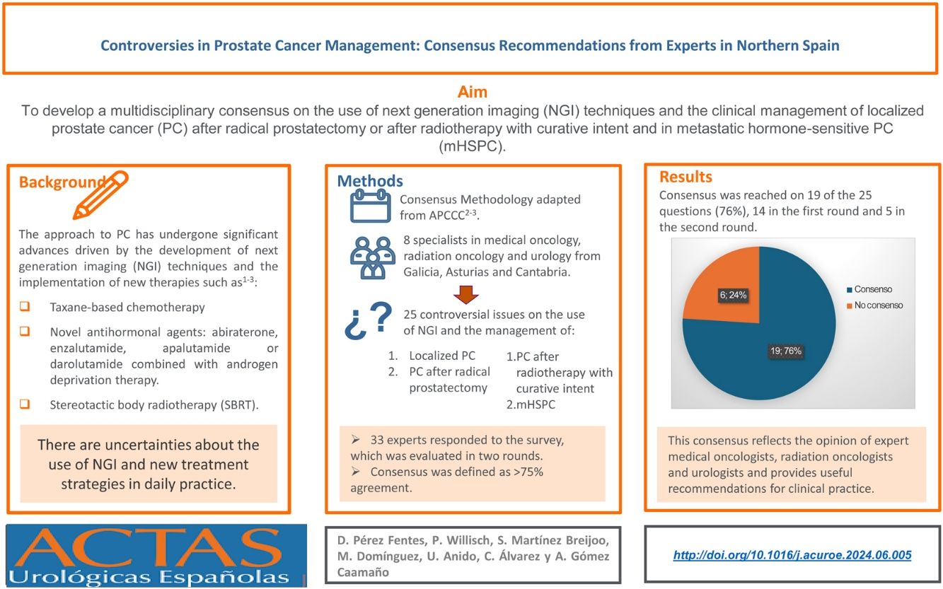 En los últimos años el manejo del cáncer de próstata (CP) ha presentado cambios relevantes en diferentes aspectos como la implementación de estrategias terapéuticas que incluyen el uso de nuevos agentes hormonales como abiraterona, apalutamida, enzalutamida o darolutamida y la incorporación de técnicas de imagen de nueva generación (NGI). Sin embargo, no hay evidencias sólidas sobre el papel de las NGI y la toma de decisiones terapéuticas que se derivan de sus resultados. Siguiendo la metodología de la Advanced Prostate Cancer Consensus Conference (APCCC), se realizó un consenso multidisciplinar de expertos y se abordaron cuestiones controvertidas sobre el uso de NGI y el manejo clínico en cuatro escenarios considerados prioritarios: CP localizado, CP tras prostatectomía radical o tras radioterapia con intención curativa y CP hormonosensible metastásico. Este consenso refleja la opinión de médicos de oncología médica, oncología radioterápica y de urología y ofrece recomendaciones útiles para la práctica clínica.