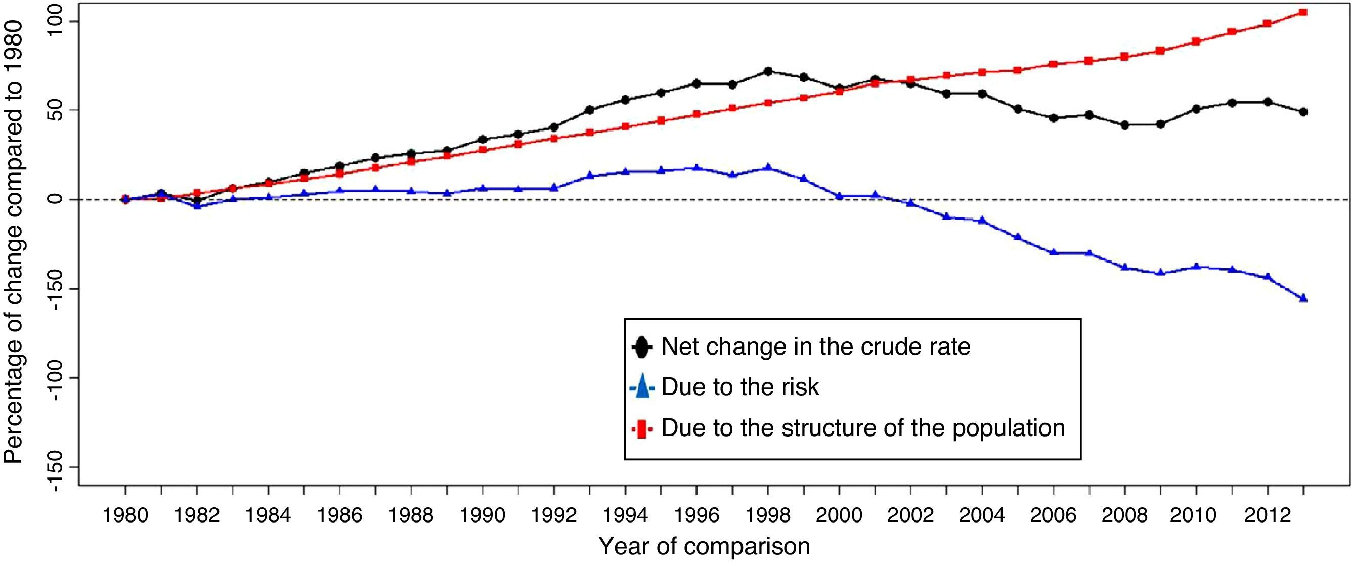 Las tasas ajustadas (globales) por edad en España descienden de 21,7 a 15,4 defunciones por 100.000 varones-año entre los años extremos del periodo estudiado (PCA: −0,9%; p<0,05). El análisis joinpoint refleja 2 periodos: 1980-1998 (incremento del 0,7% anual; p<0,05) y 1998-2013 en el que las tasas disminuyen de forma significativa (−3%; p<0,05). Exceptuando las ciudades autónomas de Ceuta y Melilla, en las que las tasas permanecen estables a lo largo del periodo de estudio, el resto de comunidades muestran 1 o 2 puntos de inflexión en las tendencias y todas muestran un periodo final con descenso de las tasas (exceptuando Galicia y Cataluña, en las que en el periodo 2008–2013 se estabilizan).