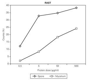 Figure 1.--RAST values obtained after incubation of CNBr-activated disks with different concentration of spore and mycelial extract of C. cladosporioides.