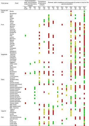 Inclusion/exclusion criteriaThe following types of studies were included: food composition tables, food analytical studies and laboratory analysis, reviews, table compilations and proposals of content in food for the general population.