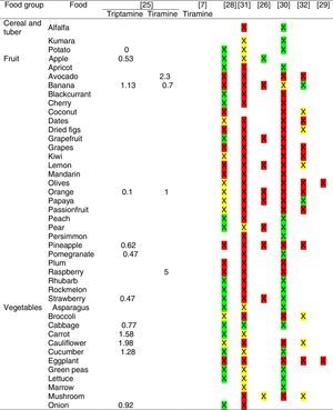 Tables were divided in three. Table 1 shows a comparison between reviews,19–32 table compilations and proposals of histamine content in food for the general population and food analytical studies and laboratory analysis. Table 2 is similar to Table 1, but shows other amines content in food and Table 3 collects those foods that were excluded from Tables 1 and 2 under the following criteria: less common foods or only 2 out of 14 references included the food in their list, both had the same colour recommendation or on the contrary had opposite colour recommendations.