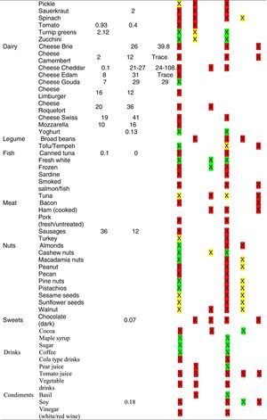 For tables that provided the amount of histamine in mg/kg per food, low content was considered to be <5mg/kg (green); moderate content 5–20mg/kg (yellow); and >20mg/kg as high content (red).