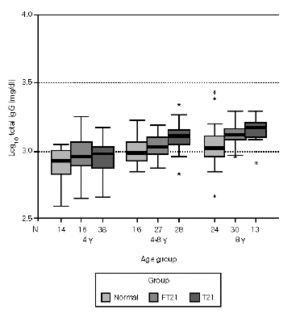 It is referred by diverse authors an increased risk for infections and a comparatively higher morality to the general population (1). Among other anomalies, it has been shown altered serum concentrations of some of the subclasses of IgG, namely IgG2 and IgG4 (2), with inferior values to the ones of the general population. The published studies in general proceed to the matching between samples from children with T21 and the normal control pupulation (2, 3). Studies with groups of children, with and without T21, with the same parenteral origin are not referred in the literature.