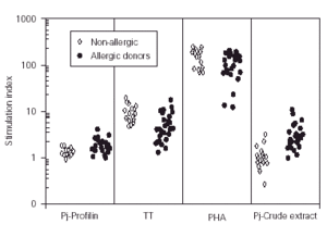 Both patients and control subjects exhibited proliferative T-cell responses to the allergen extract with maximal stimulatio ranged 1 to 100 μg/ml. To ensure that the results were not influenced by the variation in background counts, they were expressed as SI. The responses expressed as mean SI to crude extract and highly purified profilin were higher in the group of atopic patients than in the non-atopic subjects (fig. 2). Proliferative responses of patient's PBMC to Pj profilin were generally low, with SI values ranging from 1 to 6 (mean 2,04 ± 0.7 SD). This finding was in contrast with their SPT response to Pj profilin and high Pj specific IgE. Proliferative responses to TT and PHA were higher in the group of non-atopics than in patients, but the difference was not significantly (fig. 2).