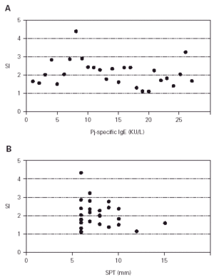 Figure 3.--(A). Specific T-cell responses to Pj profilin versus specific IgE. Results are expressed as SI obtained by Pj profilin stimulation of PBMCs from atopic donors and Pj-specific IgE (KU/L). The IgE concentrations were determined in a CAP-SYSTEM (Pharmacia, Uppsala, Sweden). Spearman rank order correlation: r = 0.16, p = 0.432. (B). Specific T-cell responses to Pj profilin versus SPT. Results are expressed as SI obtained by Pj profilin stimulation of PBMCs from atopic donors and Pj profilin wheal diameter in mm. Spearman rank order correlation: r = 0.09, p = 0.620.