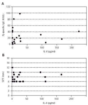 Figure 5.--Correlation between polyclonal IL-4 production and specific IgE (A) or SPT (B). Pj-specific IgE concentrations were determined in a CAP-SYSTEM. (Pharmacia, Upsala, Sweden) and expressed as KU/L. The concentration of IL-4 was determined by ELISA, and expressed as pg/ml on the supernatants of the cultures of PBMCs from Pj atopic patients stimulated with PHA (1/100) for two days. The Pj profilin wheal diameter are expressed in mm. Spearman rank order Correlation: A: r = 0.003. B: r = 0.161.
