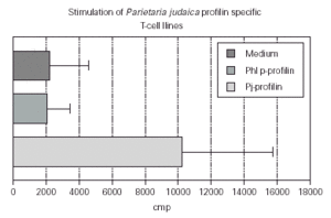In conclusion, the results of the present study show that Pj profilin specific proliferative T-cell response and the polyclonal production of IL-4 are higher in patients than in the group of control subjects. This suggests a role for Pj profilin in the induction of T-cell-driven immunological reactions. The lack of correlation between the skin reactivity and IgE-specific concentration, T-cell reactivity or IL-4 production most likely reflects the complexity of the skin reactivity, whereas the fact that the proliferative T-cell response did not correlate to the patients serum IgE suggests that at least some of the responding T-cells may be involved in immune reactions other than the support of IgE production. That profilins are ubiquous and highly conserved proteins could be the explanation of the low T-cell responsiveness and elevated SPT, in our group of patients. Pj profilin specific T-cell lines did not show cross-reactivity with a highly homologous profilin from Phl p (14).