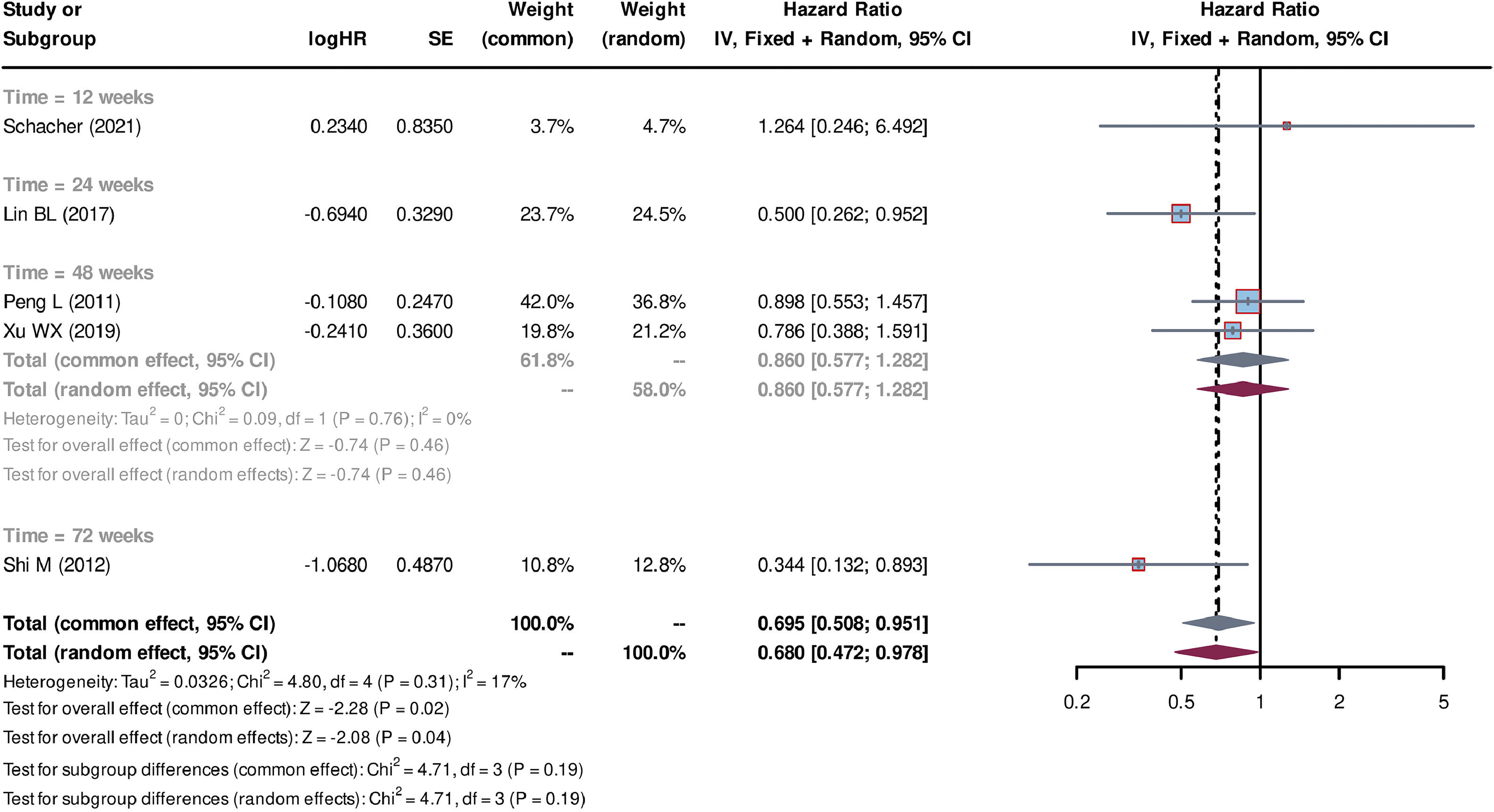 After eliminating redundant references, three researchers (HM, ZL and DZ) scanned the titles and abstracts in order to identify relevant studies. Should any discrepancies arise, the supervisors (JP and YZ) assumed the responsibility of making final judgments. The full texts and supplementary materials of the qualifying studies were subjected to thorough screening by two researchers (SL and HG), who worked independently of each other. YZ subsequently reviewed the final data for any inconsistencies, and facilitated the data correlation. JP reviewed, revised and finalized the manuscript. The following data were collected, when available: i) the study characteristics, i.e., the year of publication, primary author, country and study design; ii) the patient characteristics, i.e., the number of participants in each arm, etiologies, diagnostic criteria and duration of follow-up; iii) stem cells, i.e., the cell type, dosage, treatment frequency and route of administration; and iv) study outcomes, i.e., survival rates/curves, adverse events, model for end-stage liver disease (MELD) scores, the levels of albumin (ALB), total bilirubin (TBIL), alanine aminotransferase (ALT), and the international normalized ratio (INR) at various follow-up time points. Due to the focus on a specific time point within the Kaplan-Meier (K-M) curves and the lack of a consistent follow-up duration across the studies, utilizing the survival rate alone may not adequately reflect variations in patient prognosis among the different intervention groups [16]. On the other hand, using the hazard ratio (HR), which encompasses comprehensive information relating to the entire K-M curve, has been shown to accurately reflect the treatment effects throughout the entire follow-up period [18]. For articles that did not explicitly present HR values, the graphs and extract data points were digitized using the tool IPDfromKM [19].