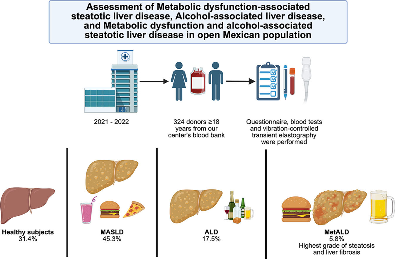 The main underlying etiologies of steatotic liver disease are metabolic syndrome and alcohol-associated liver disease (ALD). When both conditions coexist, one of the two conditions predominates, and the other serves as a cofactor. The spectrum of liver damage secondary to Metabolic dysfunction-associated steatotic liver disease (MASLD) and ALD ranges from steatosis, steatohepatitis, fibrosis, and cirrhosis to hepatocellular carcinoma (HCC) [1]. When these entities are associated, it is a synergistic damage and is known as dual damage because of the combined damage of risky alcohol consumption in a person with MASLD, which is known as Metabolic dysfunction and alcohol-associated steatotic liver disease (MetALD) [2]. We adopt the definitions of MASLD, MetALD and ALD provided by the multisociety Delphi consensus statement on new fatty liver disease nomenclature by Rinella et al. [2] as follows: MASLD is a form of steatotic liver disease characterized by the presence of hepatic steatosis in individuals with at least one cardiometabolic risk factor, such as overweight/obesity, type 2 diabetes, dyslipidemia, or hypertension, in the absence of significant alcohol intake or other competing causes of liver fat accumulation. MetALD is a steatotic liver disease occurring in individuals who have both metabolic risk factors (as in MASLD) and alcohol consumption above the threshold considered compatible with MASLD (≥20 g/day in females and ≥30 g/day in males) but below levels typically associated with classical alcohol-related liver disease. ALD is a liver injury caused by chronic, excessive alcohol consumption (≥50 g/day in females and ≥60 g/day in males), encompassing a spectrum of histological and clinical entities including simple steatosis, steatohepatitis, progressive fibrosis, cirrhosis, and hepatocellular carcinoma. Imbalance in fatty acid synthesis and β-oxidation are common pathways in both diseases leading to steatosis. In MASLD, steatosis is due to lipid accumulation, whereas in ALD, it is due to direct ethanol toxicity in hepatocytes [3,4]. There is no safe limit for alcohol consumption, and alcohol intake is associated with an increased risk of liver disease progression, including HCC [5]. The prevalence of MASLD has reached almost 24% in the Western population [6]. However, in specific sub-populations, its prevalence is significantly higher. For example, in subjects with grade 3 obesity, it ranges from 75% to 92%, while the prevalence in patients with type 2 diabetes is estimated at 60% to 70% [7]. In addition, ethnic differences in the prevalence of MASLD have been reported. Hispanic Americans have the highest prevalence at 45% [8]. Individuals of Mexican ancestry have the highest prevalence (33%), followed by Latinos of Puerto Rican origin (18%) and those of Dominican origin (16%) [9]. Another study showed that people of Mexican ancestry have the highest prevalence of MASLD (22%), followed by Central Americans (21%), South Americans(17.8%), Cubans (16.5%), Puerto Ricans (15.8%), and Dominicans (15%) [10]. On the other hand, ALD is one of the leading causes of chronic liver disease in Latin America. Alcohol has been reported to be the primary etiology of cirrhosis in Argentina, Brazil, Chile, Mexico, and Peru [11,12]. The Mexican population has inherited specific alleles from different races, predominantly Caucasian, Amerindian, and African, that predispose to liver damage due to alcohol consumption. Based on current data, there is a particular genetic profile that may explain the epidemiological and clinical manifestations of alcohol-related liver disease [13]. In patients with ALD cirrhosis, up to 33% are overweight or obese [14]. The concept of MetALD is recent; there are not enough epidemiological data that explore this group of patients. The relevance of this group lies in their potential for a higher risk of developing steatosis, inflammation, fibrosis, and cirrhosis, which may occur in a shorter timeframe. Therefore, it is essential to have information on this population in Mexico.