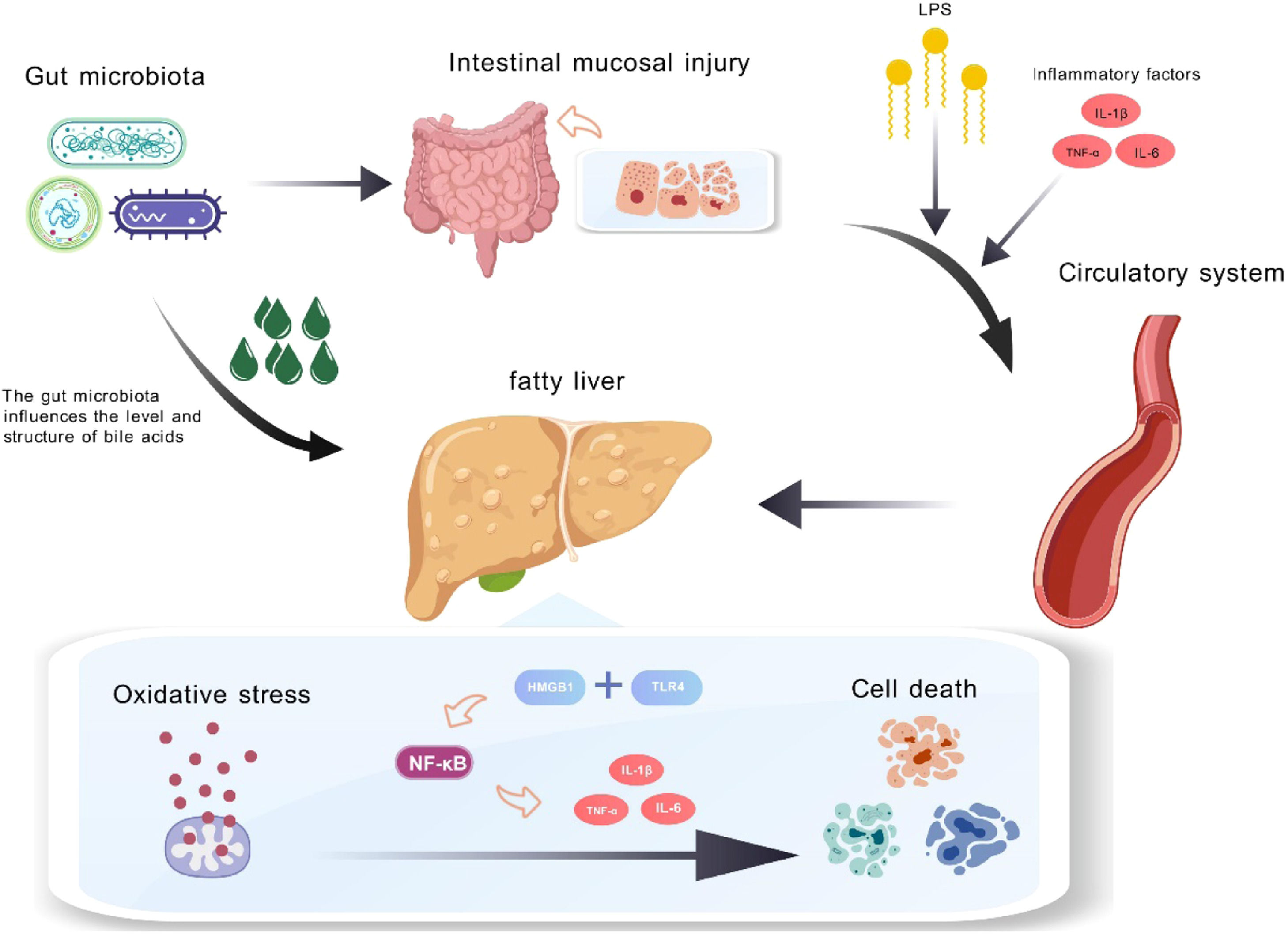 Impact of Gut Microbiota Disruption on Liver Inflammation and Cell Death. In MASLD patients, changes in gut microbiota led to intestinal damage and increased permeability, allowing lipopolysaccharides (LPS) and inflammatory factors (TNF-α, IL-1β, IL-6) to enter the bloodstream and reach the liver. Additionally, altered gut microbiota disrupts bile acid metabolism, intensifying hepatic inflammation and oxidative stress. This ROS buildup activates nuclear factor kappa B (NF-κB) signaling via TLR4, promoting inflammation and hepatocyte death.
