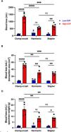 3.4Intraoperative blood loss normalized to specimen weightThe mean specimen weights in the low- and high-CVP groups were 104 ± 18 g and 79 ± 5 g (p = 0.1549), respectively (Fig. 2F). In the low-CVP group, blood loss per specimen weight was comparable among all three subgroups (CC: 1 ± 0 mL/g, HS: 2 ± 1 mL/g, and ST: 1 ± 0 mL/g). When comparing the low- and high-CVP cohorts, blood loss per specimen weight in the CC (1 vs. 16 mL/g, p < 0.0001) and ST (1 vs. 9 mL/g, p = 0.0367) subgroups was significantly higher in the high-CVP group. However, there was no significant difference between the low- and high-CVP cohorts in the HS subgroup (2 vs. 8 mL/g, p = 0.0793). When focusing on the differences in the high-CVP cohort stratified by parenchymal transection technique, it was found that the intraoperative blood loss normalized to specimen weight was significantly higher in the CC subgroup than in both the HS (16 vs. 8 mL/g; p = 0.0067) and ST subgroups (16 vs. 9 mL/g; p = 0.0097), whereas no significant difference was observed between the HS and ST techniques (8 vs. 9 mL/g; p > 0.9999) (Fig. 4C).