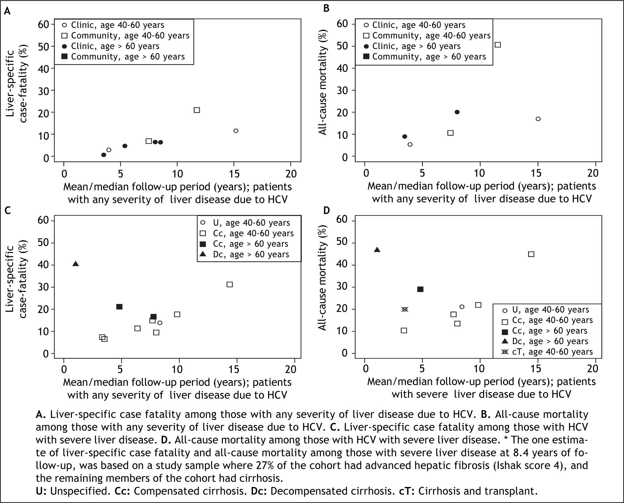 A systematic review was conducted of studies reporting on estimates of liver-specific case fatality in HCV, indexed in EMBASE and Medline. Case fatality estimates were stratified according to duration of follow up, baseline liver disease severity, sampling frame (community- or clinic-based), and treatment response (i.e., whether a sustained viral response (SVR) was achieved). We considered all-cause liver-specific estimates of case fatality, but did not synthesize estimates within individual liver disease-related fatality categories, as the categorizations of those varied between studies. Estimates of all-cause mortality were also identified and synthesized, where available.