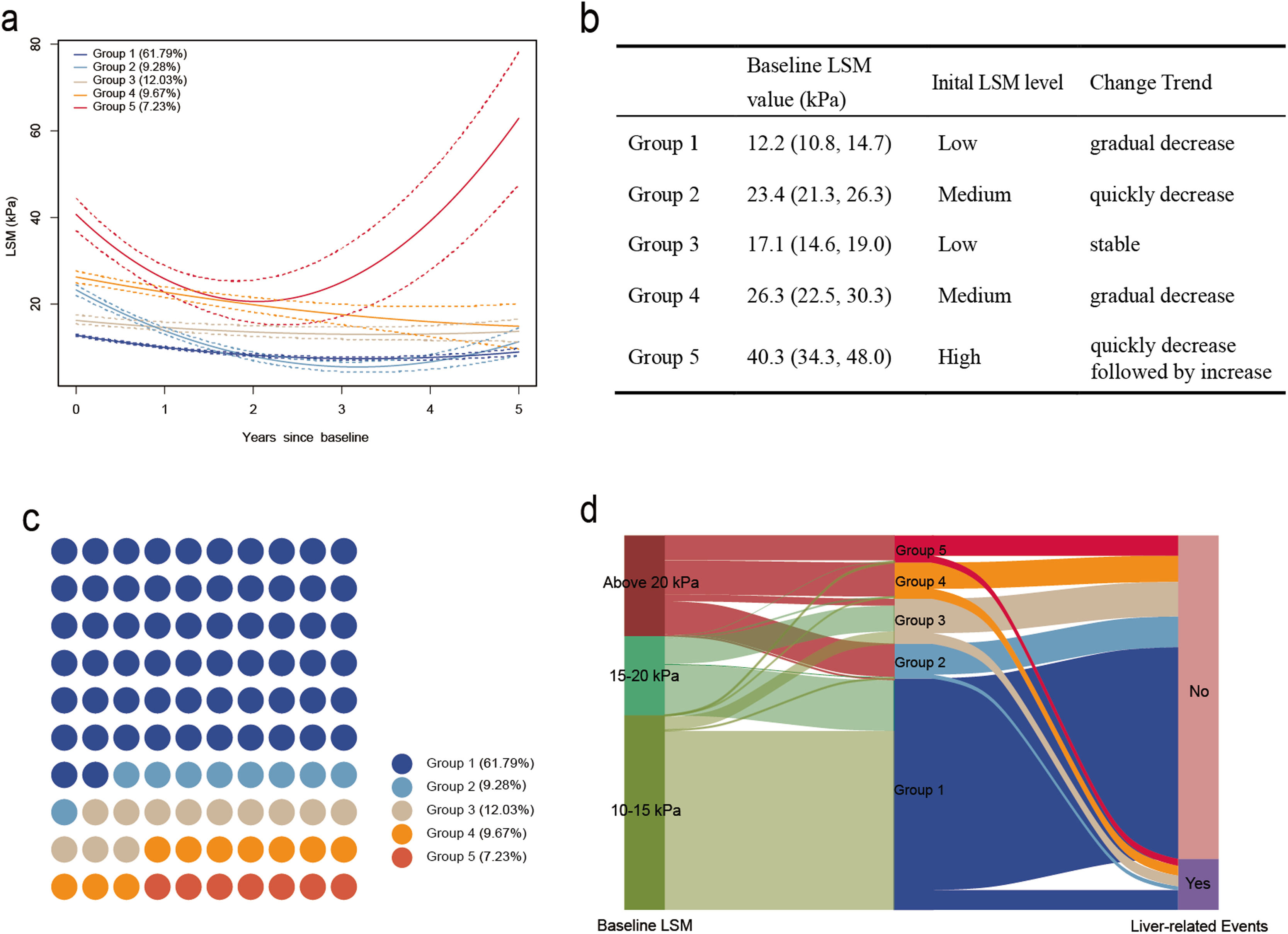 Trajectories of liver stiffness measurements (LSMs) (a). Group 1, Low gradual decrease trajectory group; Group 2, Medium quickly decrease trajectory group; Group 3, Low stable trajectory group; Group 4, Medium gradual decrease trajectory group; Group 5, High quickly decrease followed by increase trajectory group. Characteristics of different LSM trajectories (b). Population distribution of the five groups with distinct LSM trajectories (c). A total of 1272 patients were included in the study and categorized into Group 1 (786 [61.79 %]), Group 2 (118 [9.28 %]), Group 3 (153 [12.03 %]), Group 4 (123 [9.67 %]), and Group 5 (92 [7.23 %]) based on the different LSM trajectories during follow-up. Sankey diagram: Association of baseline LSM, LSM trajectories, and liver-related events in patients with chronic hepatitis B (CHB) and compensated advanced chronic liver disease (cACLD) (d). Liver-related events occurred in 8.52 % (67/786) of patients in Group 1, 11.02 % (13/118) of patients in Group 2, 23.53 % (36/153) of patients in Group 3, 27.64 % (34/123) of patients in Group 4, and 25.00 % (23/92) of patients in Group 5.