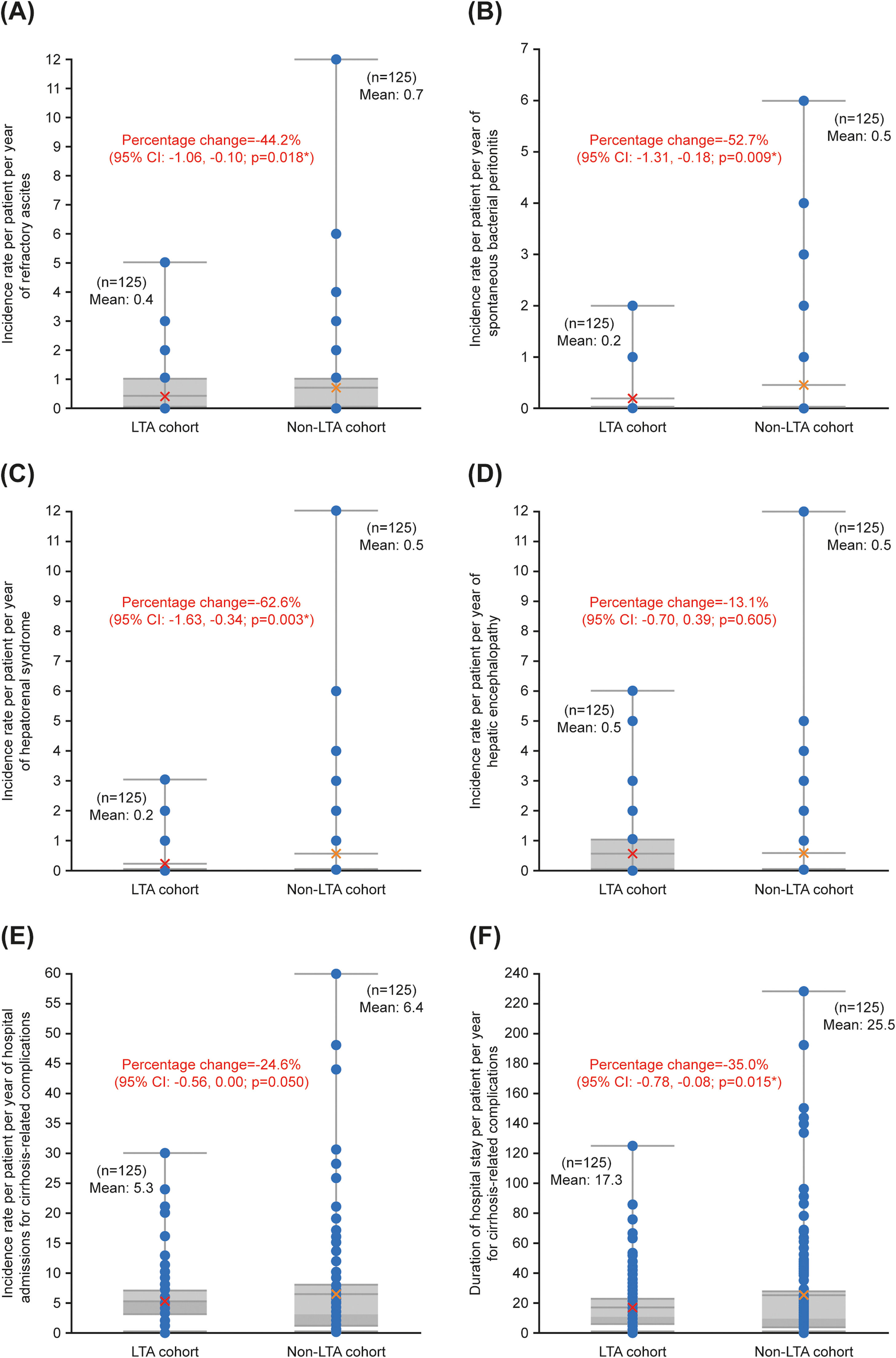 Comparison of the incidence rate per patient per year of hospital admissions for cirrhosis-related complications between the LTA and non-LTA cohorts  N/A  Number of in-patient and out-patient hospital admissions.