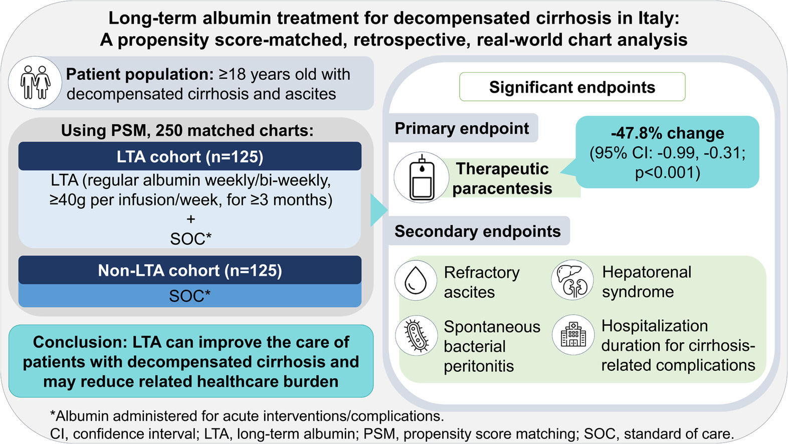 For patients with decompensated cirrhosis, long-term albumin (LTA) is a potential new treatment paradigm that goes beyond the short-term recovery of acute complications to pursue a durable, chronic replenishment of functional albumin levels and thus could restore the immunomodulatory, colloid osmotic, transport, and endothelium-stabilizing capacities of albumin [4,12]. Two Italian studies have shown that LTA treatment improves outcomes in patients with decompensated cirrhosis and ascites [13,14]. The ANSWER study was a multicenter, randomized trial involving 33 hospitals in Italy [13]. Compared with standard medical treatment (SMT) alone, LTA in combination with SMT significantly reduced mortality, incidence of paracentesis, and the cumulative incidence of cirrhosis-related complications (e.g., refractory ascites, SBP, and renal dysfunction), in patients with decompensated cirrhosis and uncomplicated ascites [13]. Additionally, a non-randomized, prospective real-world study in Italy demonstrated that LTA significantly reduced 24-month mortality and significantly lengthened the period of time free from hospital admissions, compared with the current standard of care (SOC), in patients with cirrhosis and refractory ascites [14]. As a consequence, the clinical practice guidelines on portal hypertension and ascites by the Italian Association for the Study of the Liver have included LTA among the medical treatment options for patients with ascites, including refractory ascites, with the duration of LTA adapted to the individual patient [15]. Accordingly, many treatment centers in Italy have adopted the use of LTA in patients with decompensated cirrhosis and ascites, and thus, this population provides a unique opportunity to observe the effects of this treatment in clinical practice; which importantly, has the potential to complement and verify the evidence already obtained from clinical trials.