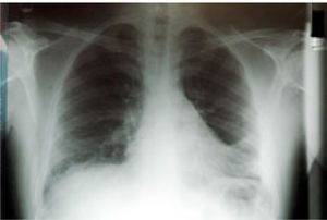 He had positive double stranded anti-DNA (ds-DNA) at 39 RU/mL (normal range: 0-20), positive anti-smooth muscle antibody (ASMA) with titre 1:160 and positive anti-nuclear antibody (ANA) with titre 1:40. His anti-mitochondrial antibodies (AMA) were negative and his Im-munoglobulin G (IgG) was raised only marginally at 17.2 (normal range: 6.0-15.0). A liver biopsy was obtained & showed changes of interface hepatitis with lobular necrosis, cholestasis and pericellular fibrosis while, in the portal tract edges non-caseating granulomas and lymphoid aggregates were present. Due to complaints of chest pain - on a follow-up examination-, a chest radiograph was requested (Figure 1) This x-ray was repeated one month later (Figure 2), while his CT scan findings are shown in figure 3.