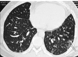 Chronic liver disease may involve the lung through abnormal communications between the portal and pulmonary veins or by changes in the lungs caused by similar biochemical abnormalities to those in liver parenchyma. Lymphocytic interstitial pneumonitis(LIP) is more common in women and is associated with autoimmune diseases. Chest x-ray findings include reticular or reticulonodular opacities while computed tomography (CT) usually shows subpleural fibrosis (predominately in basal areas), ground-glass attenuation, traction bronchiectases and pulmonary parenchymal cysts.