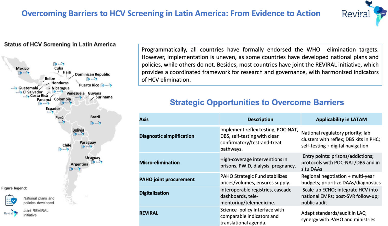Status of Hepatitis C Virus (HCV) screening implementation in Latin America. Programmatically, all countries have formally endorsed the World Health Organization elimination targets and have access to treatments and diagnostics through the Pan American Health Organization Strategic Fund. However, implementation is uneven, as some countries have developed national plans and policies, while others do not. Besides, most countries have joint the REVIRAL initiative, which provides a coordinated framework for research and governance, with harmonized indicators of HCV elimination.