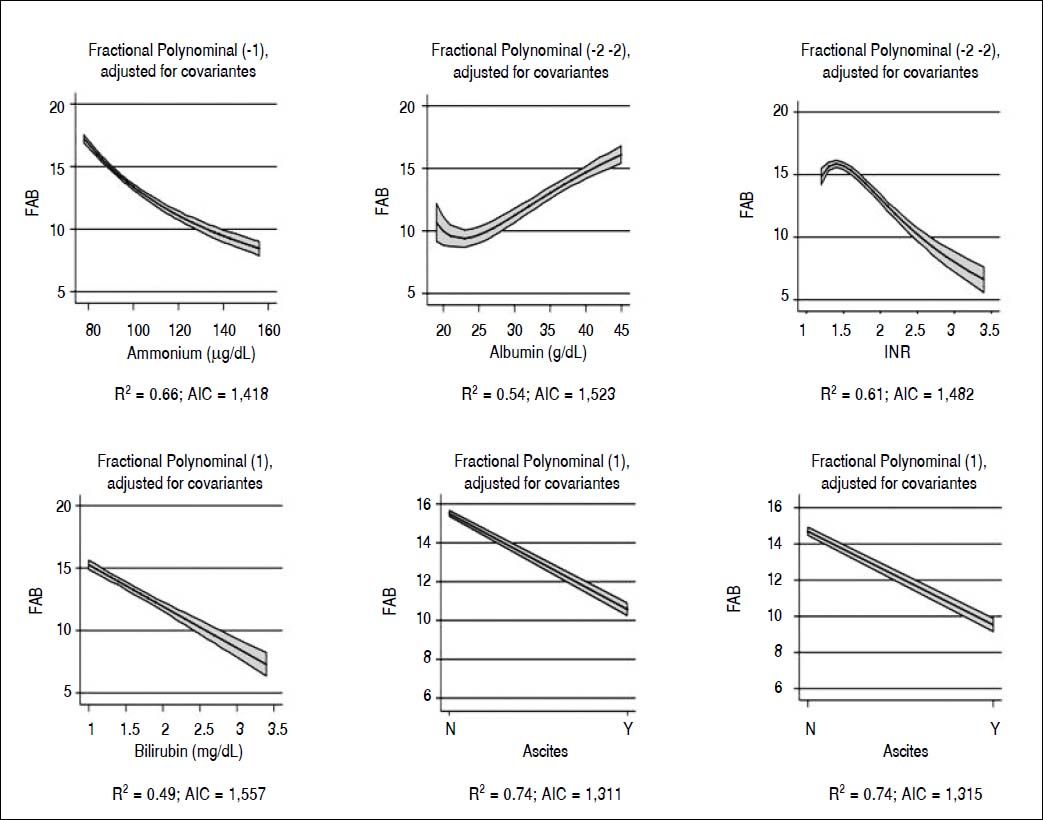 To better explore the relationship between FAB, CIR and NPI, we employed linear regression with robust confidence intervals and multivariable fractional polynomials to model non-linear predictors. The same model was used to evaluate the relationship between FAB and continuous biochemical indexes (ammonium, albumin, INR, bilirubin) and dichotomous clinical signs (ascites and hepatic encephalopathy). Akaike information criterion (AIC) was used to compare different predictors of FAB.