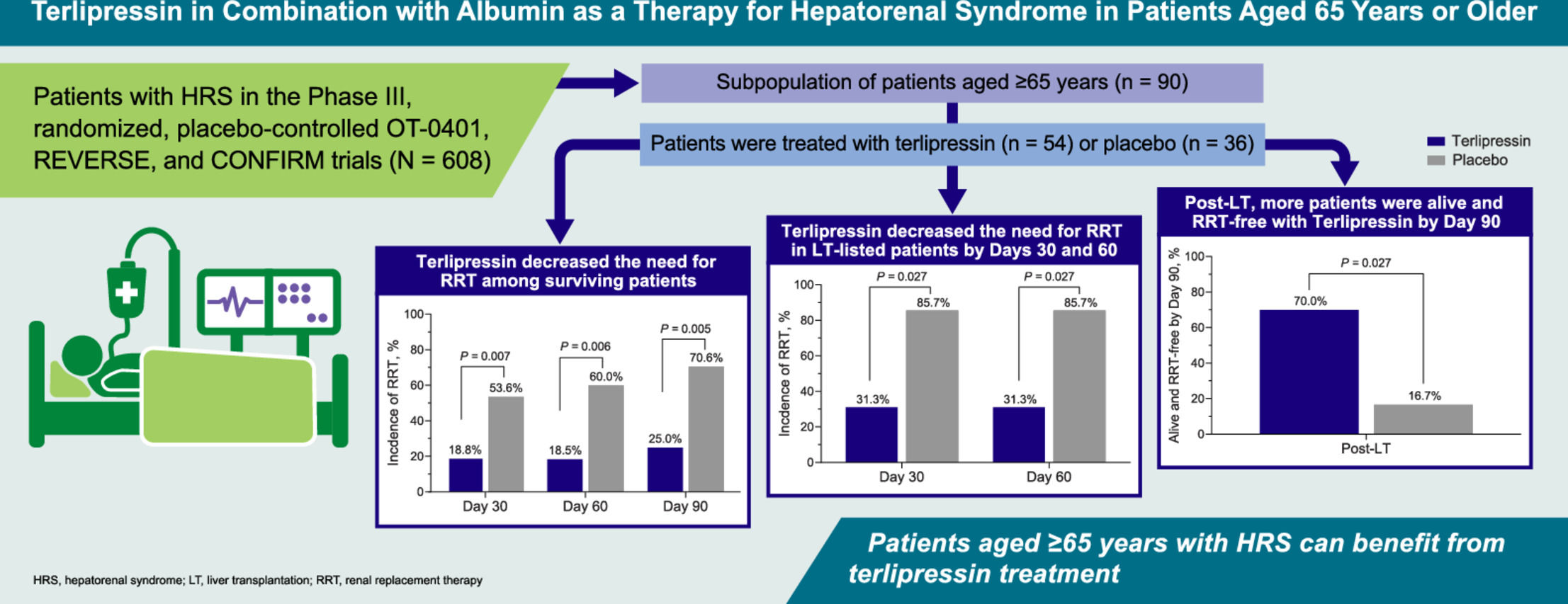 For those patients who were listed for LT at baseline, a difference in the percentage of patients who received a transplant was observed between treatment groups. In the pooled population of patients aged ≥65 years from CONFIRM and REVERSE, 50% of patients who were listed for LT at baseline in the terlipressin group and all patients in the placebo group received a transplant by Day 90. Notably, all patients who received a transplant were alive at the end of the observation period, while 62.5% of those who did not receive a transplant died. One of the limitations of this analysis is that the reasons for not receiving a transplant for LT-listed patients were not recorded.