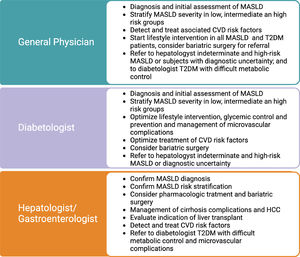 3Clinical implications of the MASLD and T2DM association: surveillance, diagnosis, and stagingClinicians should be aware of the consequences of the symbiotic association between T2DM and MASLD. Due to the high prevalence and multisystemic implications, their management should not be restricted to liver specialists; on the contrary, it should be expanded to general practitioners, internal medicine, cardiologists, diabetologists, and endocrinologists, among other specialties. Table 1 describes the role of general physicians, diabetologists, and gastroenterologists/hepatologists in MASLD care in subjects with T2DM. The clinical implications of this relation will be detailed in the following sections and are summarized in Fig. 1.