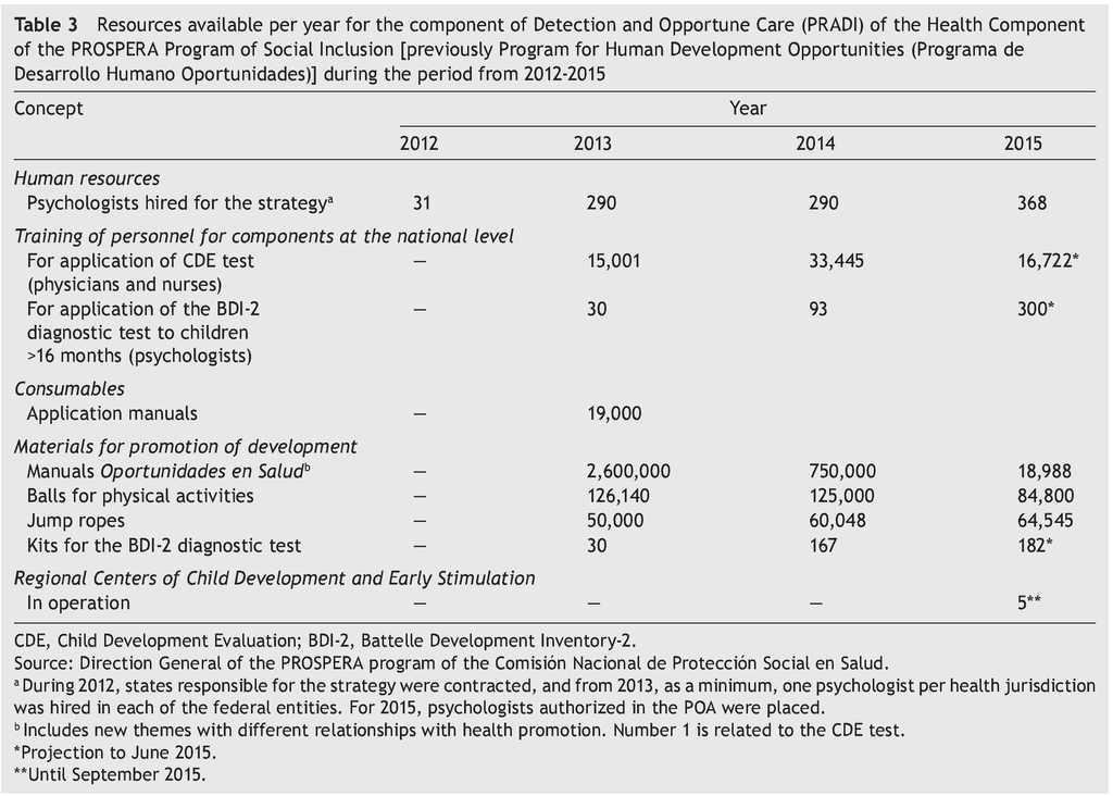 The authors acknowledge the Coordinación Nacional de PROSPERA Programa de Inclusión Social (Paula Angélica Hernández Olmos, Hugo Erick Zertuche Guerrero); to Hospital Infantil de México Federico Gómez (César Iván Baqueiro Hernández, Evelyne Rodríguez Ortega, Jessica Guadarrama Orozco, Hortensia Reyes Morales, Elías Hernández Ramírez, Ana Alicia Jiménez Burgos, Marta Lia Pirola, Rocío del Carmen Córdoba García, Beatriz Romo Pardo, Silvia Liendo Vallejos, Socorro De la Torre); to CeNSIA (Ignacio Villaseñor Ruíz, Verónica Carrión Falcón, José de Jesús Méndez de Lira, Diana Araujo, María Magdalena Solares Llamas); Inter-american Development Bank (Caridad Araujo, Ricardo Pérez Cuevas); and to the Régimen Estatal de Protección Social en Salud, Coordinaciones Estatales de PROSPERA of the 32 federal entities, as well as to the staff and psychologists of the Estrategia de Desarrollo Infantil (PROSPERA) and to the personnel of the Programa de Atención a la Salud de la Infancia y la Adolescencia.