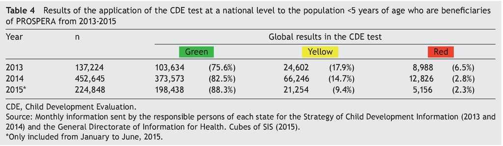 Starting in 2014, the CDE test replaced the previous technical guideline and, together with the BDI-2 and early stimulation by competencies, is part of the new technical guidelines for early child development that outline the care of children <5 years of age in this matter throughout the country.4