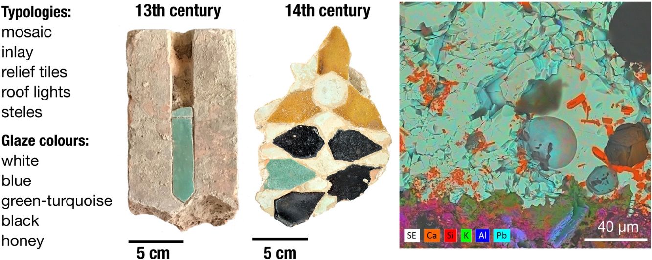 Honey glazeThe 14th century AD studied honey glazes were taken from the sampled tiling mosaic panels decorated in white and black (Fig. 2). Although honey glazes are compositionally similar, each glaze shows peculiarities related to weathering and microstructure.