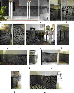 En las habitaciones o recintos interiores y patios del siglo xiv del Palacio Mudéjar del Alcázar se aplicó de forma extensiva la técnica de alicatar. Pleguezuelo ha realizado un importante trabajo histórico artístico sobre los azulejos del Alcázar de Sevilla destacando el que hizo sobre el Palacio Mudéjar [18,19]. La colorimetría de los azulejos del Patio de las Doncellas ha sido investigada por Melgosa et al. [20]. La composición de los zócalos del Palacio Mudéjar es bastante homogénea en todas sus estancias y sus leves diferencias no resultan suficientemente significativas como para extraer conclusiones de carácter cronológico. Tan solo los diferentes niveles de complejidad y pericia técnica parecen revelar un proceso de progresiva simplificación desde el siglo xiv hasta el xvi. Las piezas cortadas con procedimientos artesanales son relativamente fáciles de distinguir de aquellas otras obtenidas con métodos más o menos mecanizados o incluso industriales. Estas diferencias conducen a atribuir a ambos procedimientos cronologías diferentes. Ello ha permitido identificar las restauraciones o fabricaciones de los siglos xix y xx.