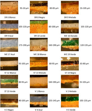 Estratigrafías de las muestras. Las estratigrafías se prepararon en moldes de polimetilmetacrilato [27,28] en el que se incluye la micromuestra, rellenado con resina de metilmetacrilato que se corta perpendicular a la capa de vidriado y se pule. Esto permitió observar los distintos estratos de la cerámica.