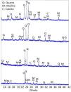 XRD analysis was also carried out to see the condition of the samples under the effect of curing temperatures and times. The compositions of the products formed as a result of the matrix reactions were investigated using the XRD technique. XRD patterns of samples cured at 60 and 80°C for 24 and 72h are shown in Fig. 4. As a result of geopolymerization, calcite, and mullite components were formed together with the main quartz component. While the patterns corresponding to the amorphous phase were detected, quartz peaks were formed at 20–40° 2-theta phase intervals. When the variation of the peaks was examined, it was observed that higher peak values were formed as a result of the increase in thermal curing and time increasing the homogeneity and the degree of geopolymeric reaction by providing continuity in the geopolymer matrix, as in the results of the SEM analysis.