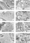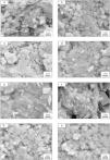 Effect of milling time on the particle size of monticellite based ceramic powdersMilling was performed using a planetary ball mill in order to obtain a particular particle size distribution. Images of synthesized powder at 800°C for 4h (SP-800°C-4h), crushed SP-800°C-4h in an agate mortar and ball-milled SP-800°C-4h for 2h are given in Fig. 2. Three characteristic particle diameters of boron derivative waste, crushed SP-800°C-4h and ball-milled SP-800°C-4h for 1, 2, 3 and 4h determined by laser diffraction particle size analysis and also mean crystallite size of monticellite are given in Table 2. The waste consisted of fine particles with a narrow particle size range. The crushed powder after synthesis was composed of particles in a broad size range of 0.5–42.8μm with an average size of 3.0μm. It was associated with phase transformations in waste and particle agglomeration during heat treatment. With the increase of milling time up to 2h, particle size range became narrower (0.5–4.8μm) and the decreasing of both mean particle size (1.4μm) and mean crystallite size of monticellite (30.51nm) went further. However, the ball-milling for more than 2h was inefficient to decrease the particle size range and crystallite size of monticellite. A noticeable broadening in particle size range and crystallite size of SP-800°C-4h-milled-3h and SP-800°C-4h-milled-4h was observed due to the agglomeration of powder particles and the growth of monticellite crystals. The optimal milling time was selected 2h in order to obtain the lowest average particle size and the narrowest particle size distribution.
