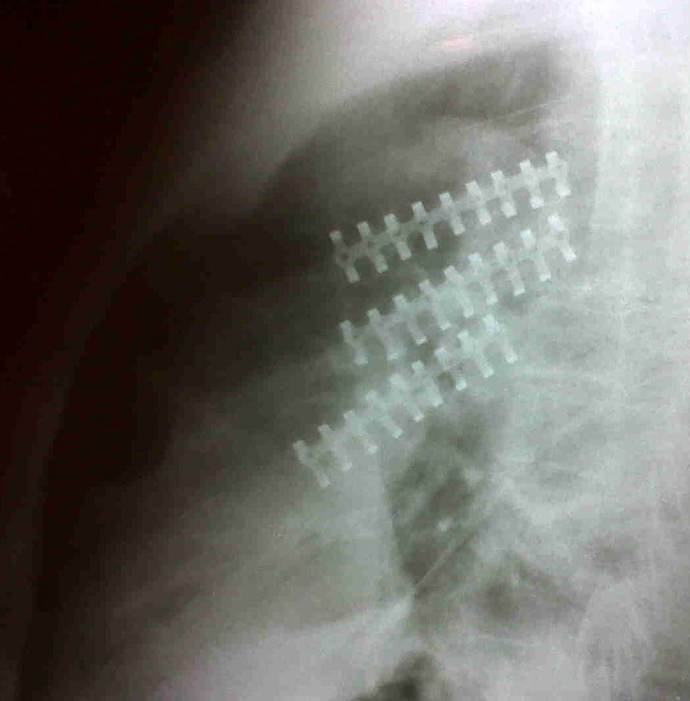 Flexible staplesThese are devices in the shape of staples that are placed on the anterior surface of the rib. In addition, they have flexible sheets that surround the rib on each side of the fracture, imparting stability to the structure. The advantage is that they do not require screws or perforation of the bone, which makes removal easy, but it is highly likely they could compress the intercostal nerve.26
