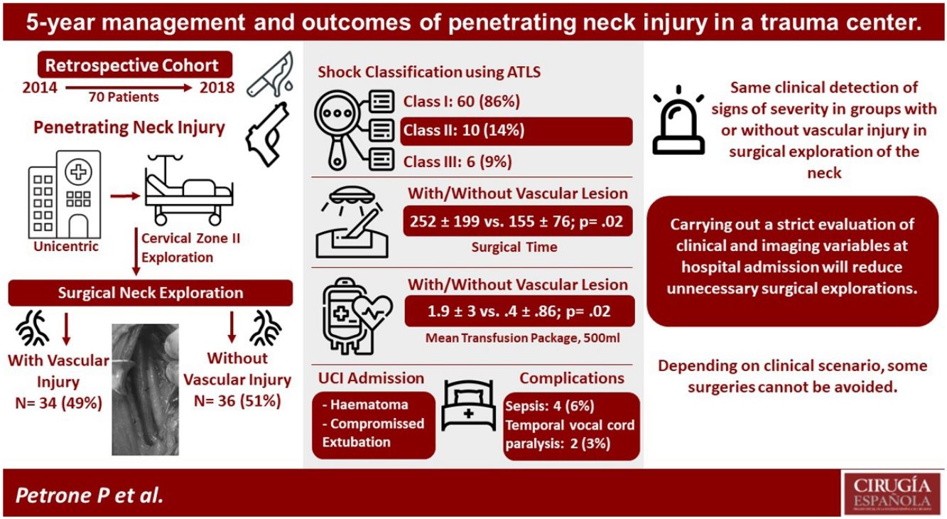ConclusionesNuestra prevalencia de exploración quirúrgica de cuello sin lesión vascular fue ligeramente superior (49 vs. 40%) que la literatura. Destacamos la importancia de no realizar exploraciones de cuello en todos los pacientes que presentan una lesión penetrante. No obtuvimos diferencias entre grupos para signos duros y signos blandos. No pudimos identificar si hubiera o no una lesión en función de las características clínicas. Se deben realizar estudios de imagen para evitar exploraciones innecesarias del cuello; sin embargo, dependiendo del escenario clínico, no se pueden evitar algunas cirugías.