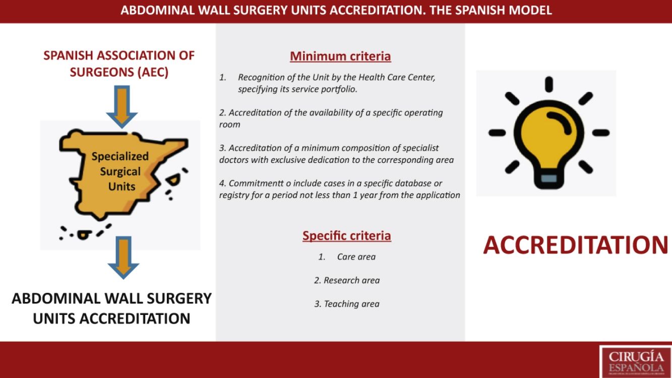 The Spanish Association of Surgeons (AEC) deems it essential to define and regulate the acquisition of high-specialization competencies within General Surgery and Gastrointestinal Surgery and proposes the Regulation for the accreditation of specialized surgical units. The AEC aims to define specialized surgical units as those functional elements of the health system that meet the defined requirements regarding their provision, solvency, and specialization in care, teaching, and research. In this paper we present the proposed accreditation model for Abdominal Wall Surgery Units, as well as the results of a survey conducted to assess the status of such units in our country. The model presented represents one of the pioneering initiatives worldwide concerning the accreditation of Abdominal Wall Surgery Units.
