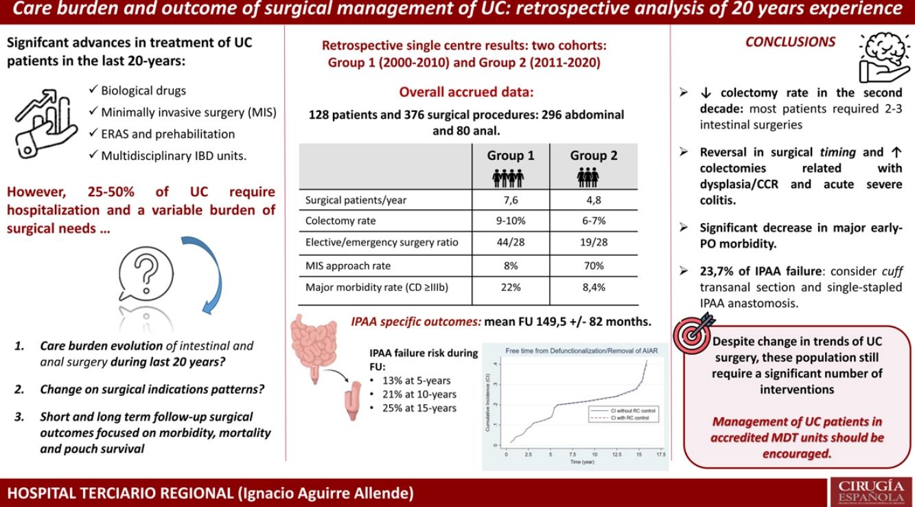 ConclusionesEl número de colectomías y de intervenciones por paciente disminuyó en la última década, a la vez que hubo mejorías en la morbilidad y el abordaje quirúrgico. La necesidad de cirugías secuenciales y de una vigilancia instrumental activa a largo plazo por el posible deterioro funcional constituye una importante carga clínica.