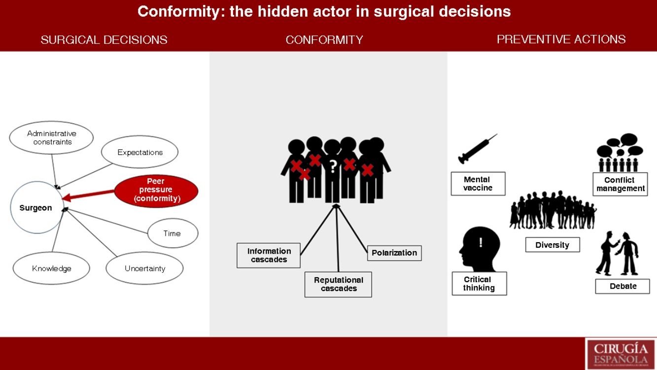 Conformity in decision making has a relevant impact in surgical environments. This manuscript reveals how group-based opinions can distort the surgeon's individual judgment, even in critical situations. Two key phenomena are analysed: communication cascades and group polarisation, which amplify conformity and lead to extreme and sometimes harmful decisions.