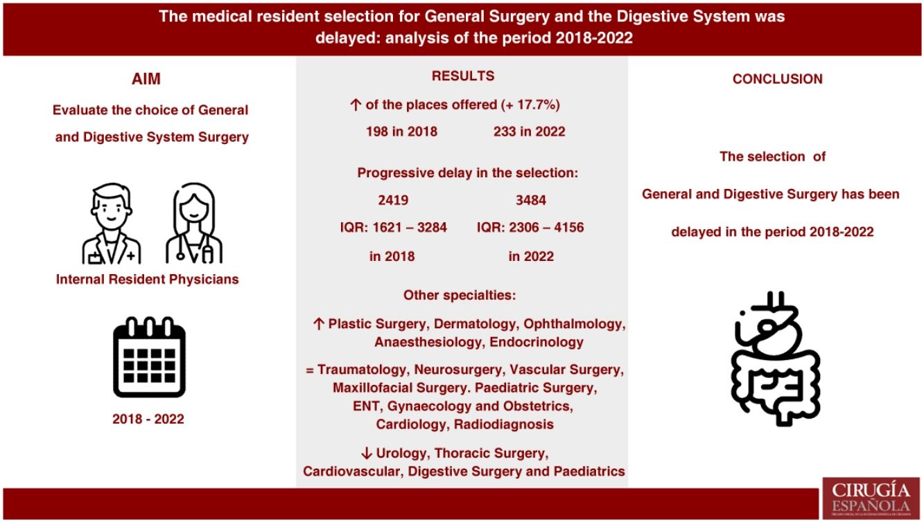 In conclusion, the election of the speciality is General and Digestive Surgery has been delayed based on the data from the 2018–2022 resident selection. The increase in the number of places offered has not been associated with a proportional increase in demand, unlike that which occurred with other specialties.