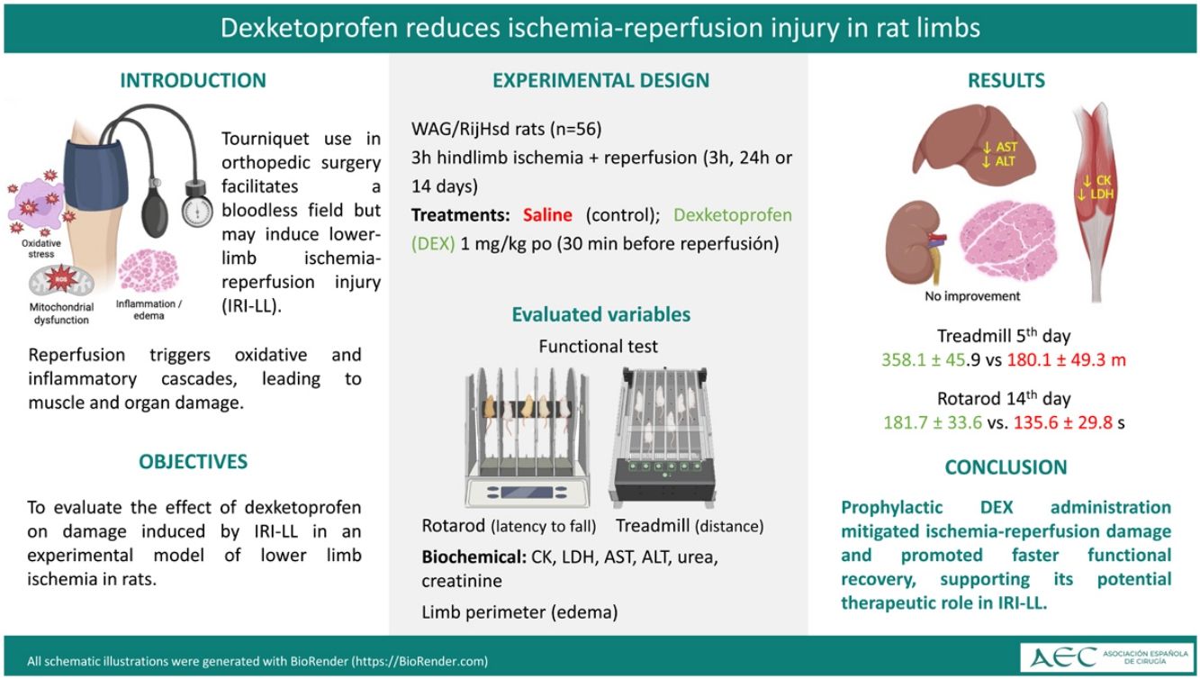 El síndrome de isquemia-reperfusión de las extremidades inferiores (IRI-LL) desencadena una respuesta inflamatoria sistémica tras la restitución del flujo sanguíneo en un miembro previamente isquémico. Este estudio evaluó si la administración de dexketoprofeno (DEX) antes de la reperfusión mitiga el daño por IRI-LL. Se utilizaron 56 ratas macho WAG/RijHsd distribuidas en un grupo control, tres grupos vehículo y tres tratados con DEX. Tras 3 h de isquemia en la extremidad posterior, la reperfusión se mantuvo durante 3 h, 24 h o 14 días. DEX (1 mg/kg, p.o.) o suero salino se administraron 30 min antes de la reperfusión. Se analizaron marcadores bioquímicos, perímetro del miembro y función motora (rotarod y treadmill). DEX redujo significativamente los marcadores séricos de daño muscular y hepático, sin modificar los parámetros renales ni el edema. Desde el día 5 se observó una mejor recuperación funcional. La administración profiláctica de DEX atenuó eficazmente el daño bioquímico y funcional secundario a la IRI-LL.