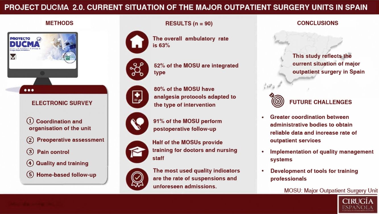 The Spanish Association of Major Outpatient Surgery (ASECMA for its initials in Spanish) launched the DUCMA project (Directory of Major Outpatient Surgery Units) in 2013, a pilot study to understand the reality of the MOSU in Spain. Thirty-eight MOSU participated, a non-representative sample of the MOS in our country. The conclusions of the study indicated that it would be advisable to redefine the survey questions and continue collecting information to expand the sample.3
