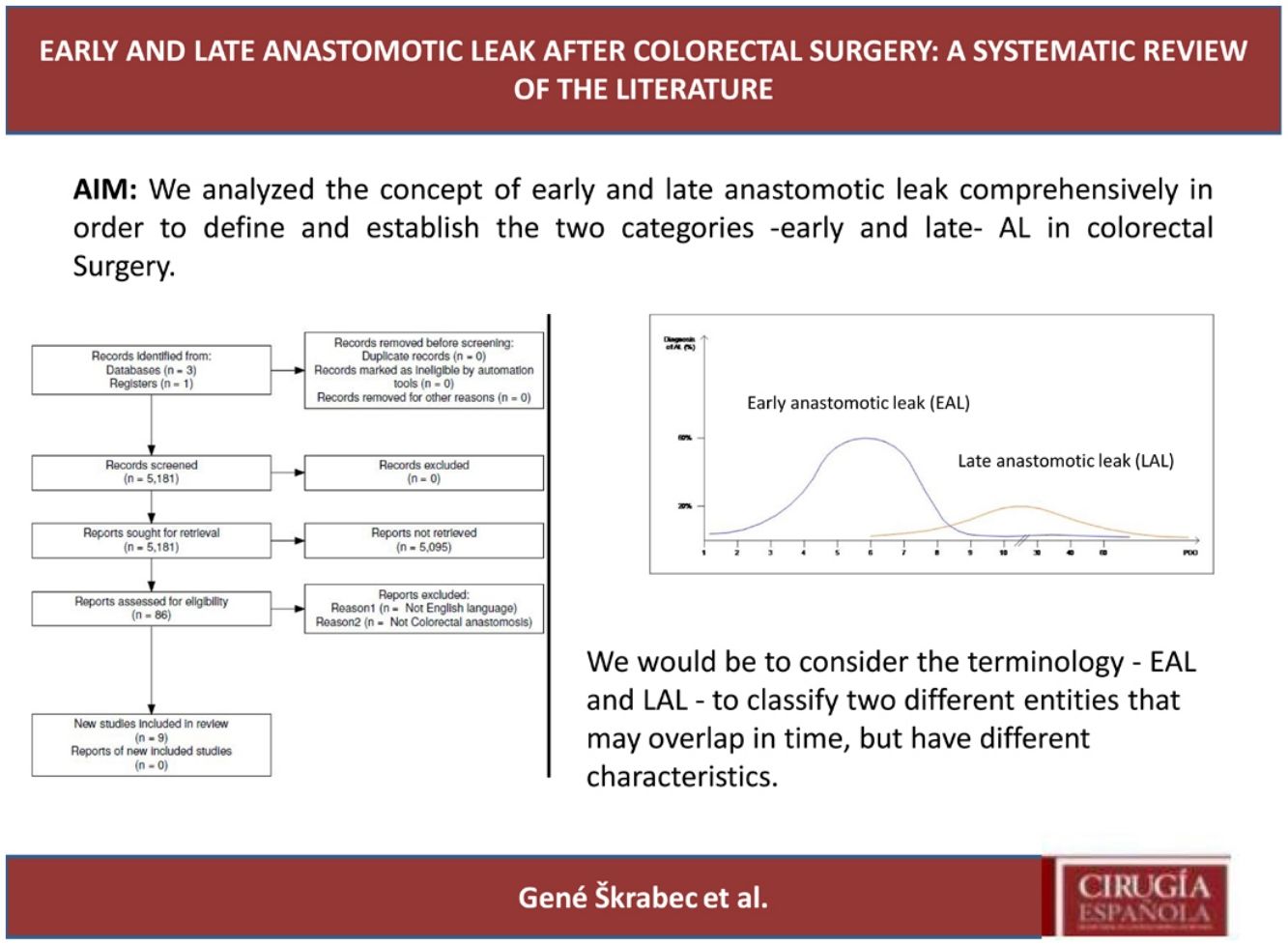 An electronic systematic search for articles on Colorectal Surgery, AL and its timing was undertaken using the MEDLINE database via PubMed, Cochrane and Embase. The selected articles were thoroughly reviewed and assessed for methodological quality using a validated methodology quality score (MINCIR score). This review was registered in the PROSPERO registry under ID: CRD42022303012. 9 articles were finally reviewed in relation to the topic of early and late anastomotic leak.