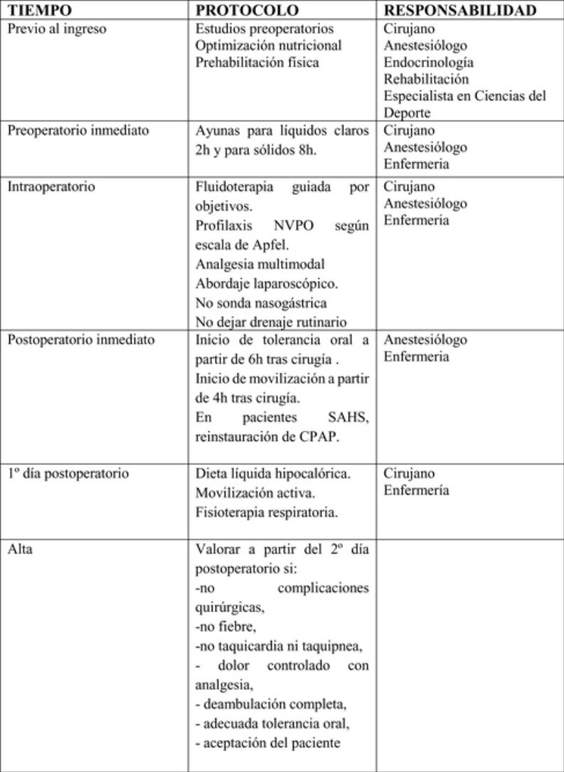 Enhanced recovery after surgery (ERAS) protocols are care programs based on scientific evidence and focused on postoperative recovery. They encompass all aspects of patient care and require multidisciplinary management, with the participation of diverse specialists. The implementation of these protocols is being extended to several abdominal and extra-abdominal surgeries, including bariatric approaches.