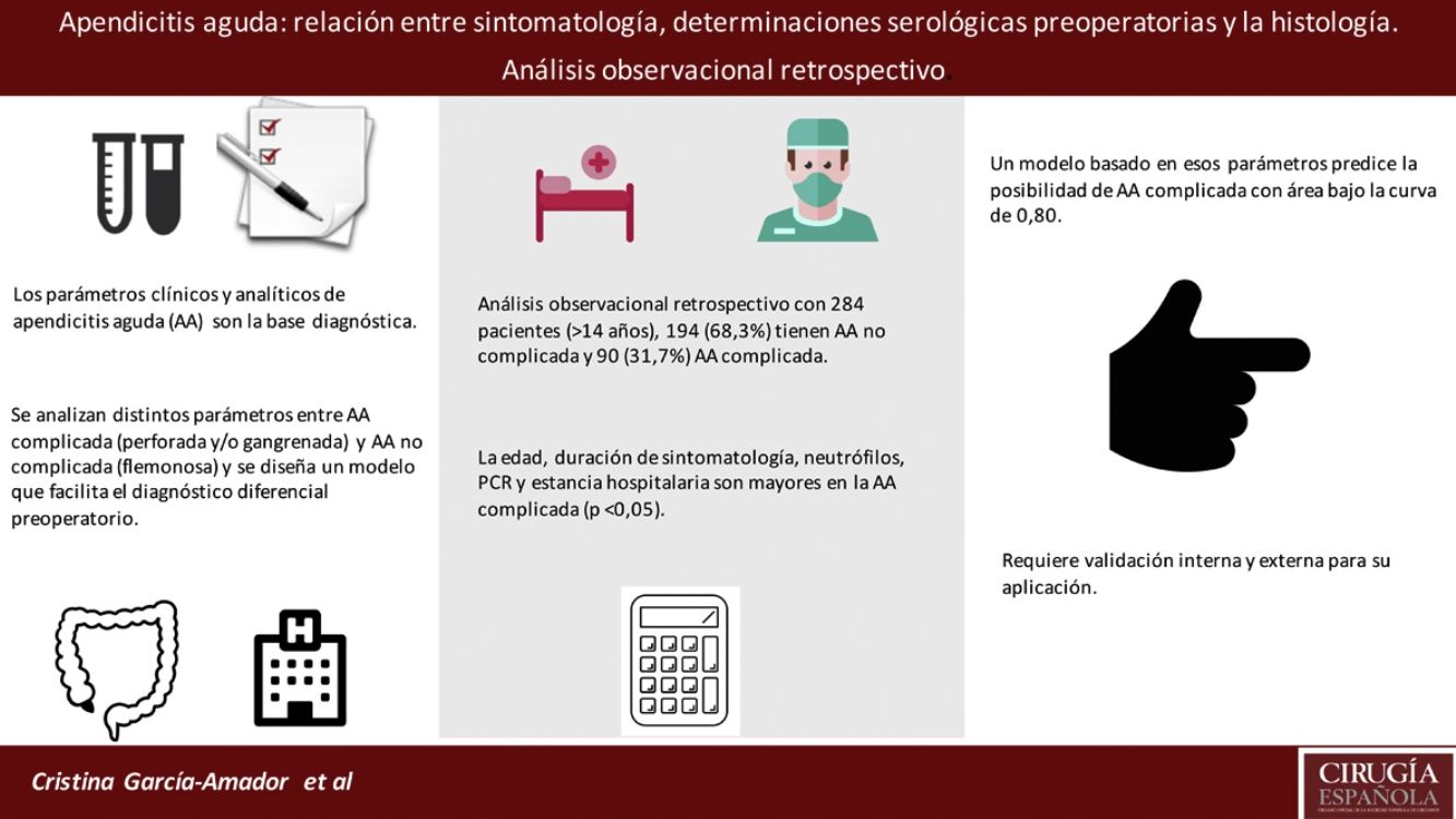 Please cite this article as: García-Amador C, Arteaga Peralta V, de la Plaza Llamas R, Torralba M, Medina Velasco A, Ramia JM. Valoración de parámetros clínicos y analíticos preoperatorios en apendicitis aguda complicada. Score para predecir apendicitis complicada. Cir Esp. 2021;99:282–288.
