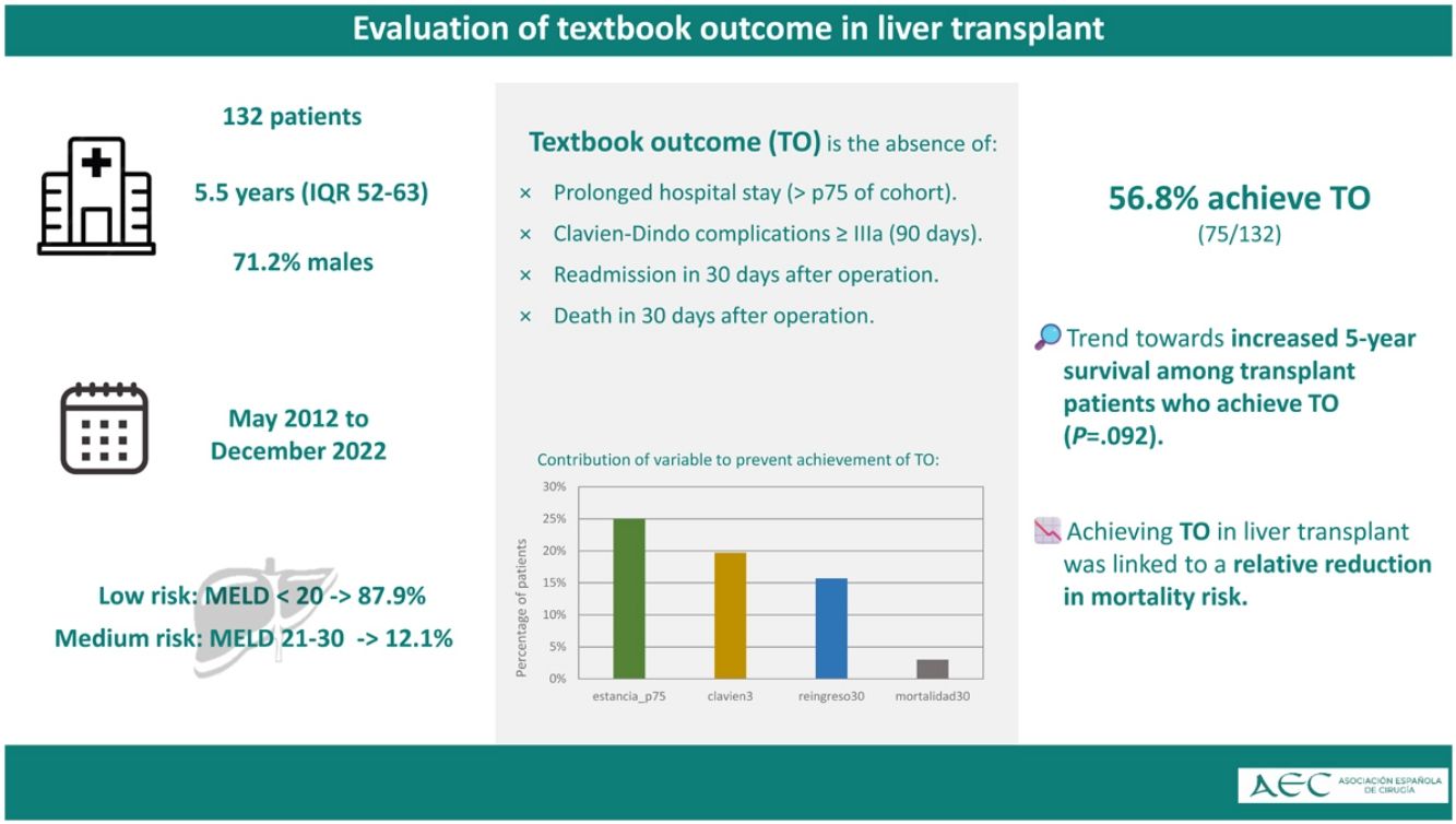 El textbook outcome (TO) es una herramienta de medida cualitativa para procedimientos quirúrgicos ya probada en multitud de procedimientos. El trasplante hepático (TH) es una de las intervenciones más complejas en nuestra especialidad. En este trabajo evaluamos la consecución del TO en pacientes sometidos a TH. Proponemos, además, una definición de TO específica para la cirugía del TH.