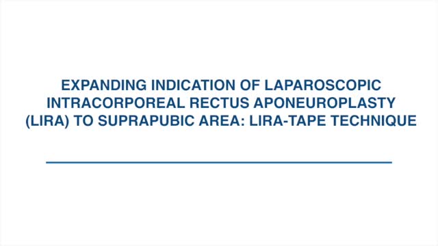 Laparoscopic intracorporeal rectus aponeuroplasty (LIRA) is a minimally invasive technique described to repair M2–M4 primary and incisional hernias. Defects below this area (M5 – Suprapubic area) could be treated using the concept associated to LIRA, expanding the indication of this technique in combination with a transabdominal partially extraperitoneal (TAPE) repair. The aim of this video is to show the surgical steps in the combination of LIRA & TAPE for M2–M5 ventral hernias.